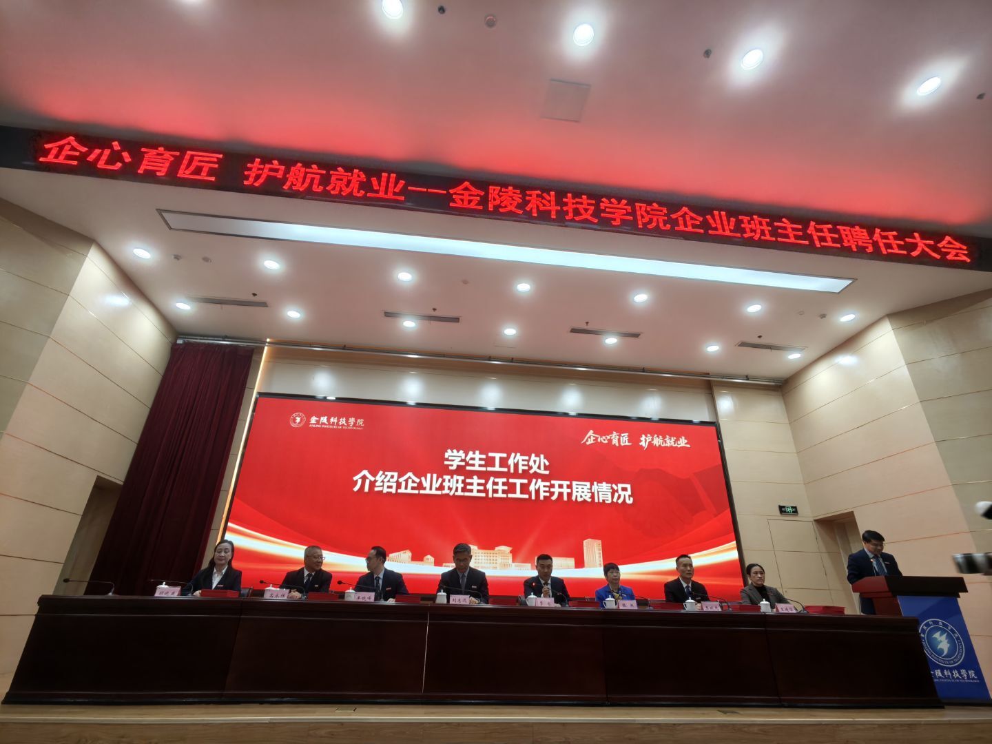 2025年11月26日,金陵科技学院企业班主任聘任大会在金陵科技学院科技楼报告厅举行。江苏金年会诚信至上科技(集团)股份有限公司唐佩、徐敏博、罗涛、孙文雅同志受聘金陵科技学院软件学院企业班主任,并随后在学院组织下,参观金陵科技学院科创空间,参加学院研讨会。